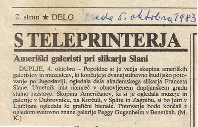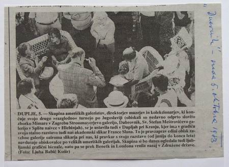 5 4. oktober 1983 OBISK AMERIŠKIH GALERISTOV samostojna slikarska razstava Franceta Slane Ameriški galeristi so se tokrat že drugič mudili v Dupljah. Zopet so si ogledali najnovejše slike akademskega slikarja Franceta Slane. 5