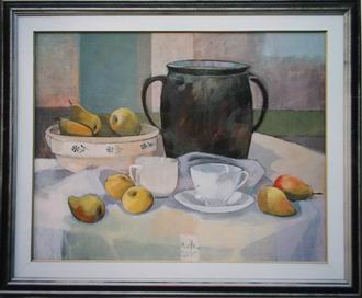 je bila to slika: Črni lonec in hruške, akril na platnu, delo Mojce Vilar iz