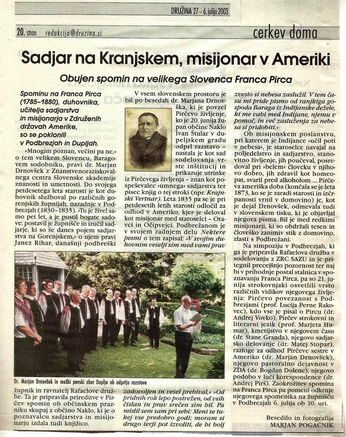 Pirca, duhovnika in sadjarja na Kranjskem ter misijonarja v Združenih