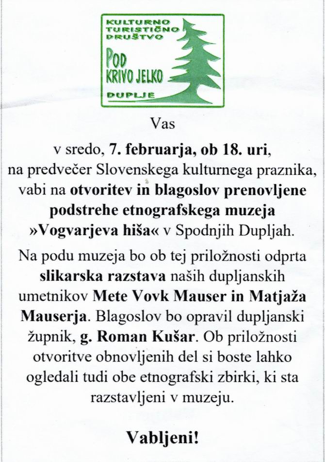 otvoritev: 7. 2. 2024 v okviru Slovenskega kulturnega praznika in otvoritve obnovljene Vogvarjeve hiše.