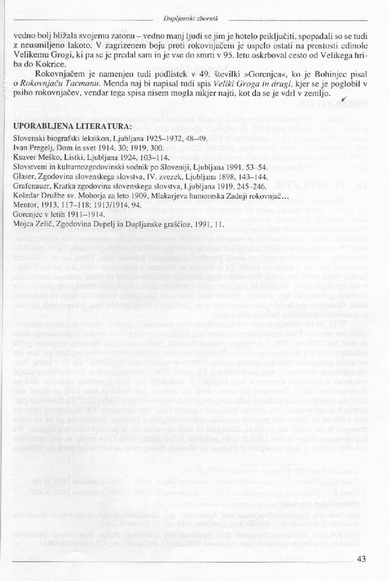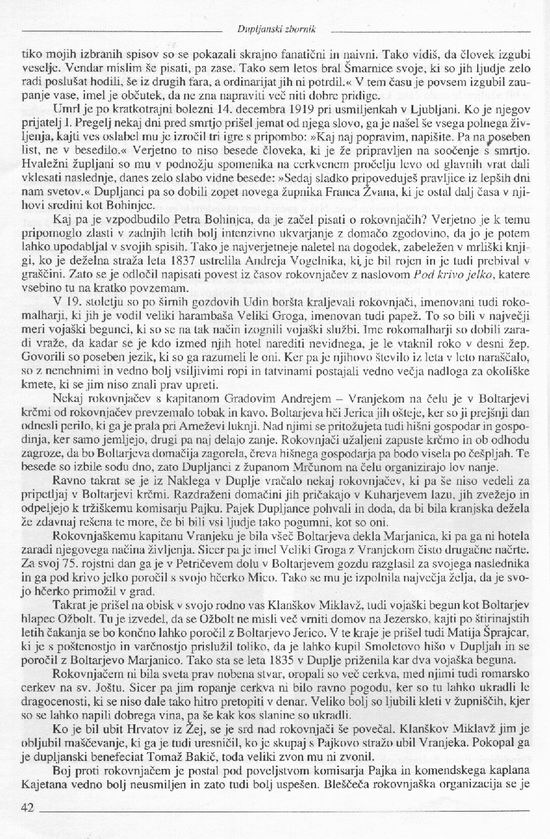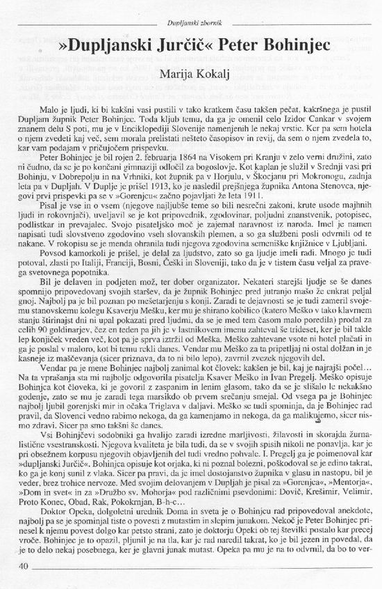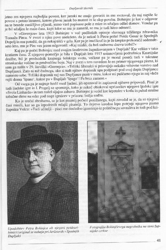 Peter Bohinjec je bil rojen na Visokem pri Kranju, 21. 2. 1864, umrl pa v Dupljah, 14. 12. 1919. Kot duhovnik je služboval v raznih krajih (Vrhnika, Horjul, Mokronog,...) nazadnje v Dupljah. Kot pisatelj in publicist pa je pričel s kratkimi pripovedmi, nato pa z daljšimi povestmi predvsem o kmečkem življenju (Jarem pregrehe, 1985; Kovač in njegov sin, 1907) in pa nekaj zgodovinskih povesti (Najmlajši mojster, 1896; Za staro pravdo, 1901) med najbolj uspele pa spada psihološko poglobljena povest v pismih Volja in nevolja, 1898. Posnemal je realiste, bil je spreten fabulist in popularen večerniški pisatelj. Za vas Duplje je še posebno zanimiva njegova zgodovinska povest iz časov rokovnjačev na Kranjskem, ki jo je poimenoval »POD KRIVO JELKO«. Na pisanje te povesti ga je po vsej verjetnosti napeljal pripis v mrliški knjigi, da je Andreja Vogelnika, ki je bil rojen in je tudi prebival v dupljanski graščini, leta 1837 ustrelila deželna straža. Povest je po Bohinjčevi smrti leta 1923 založil Anton Turk, knjigar v Ljubljani. Pred nekaj leti pa je to knjigo ponatisnilo lokalno kulturno turistično društvo Pod krivo jelko Duplje, ki je po naslovu povesti prevzelo tudi ime in kar nekaj vsakoletnih dogodkov, ki jih društvo organizira se neposredno navezuje na rokovnjače, ki so se v bližnjem Udin borštu resnično skrivali. Več o Petru Bohinjcu, predvsem pa povzetek vsebine povesti Pod krivo jelko si preberite v Dupljanskem zborniku v članku: Marija Kokalj, »Dupljanski Jurčič« Peter Bohinjec, Dupljanski zbornik, Duplje 1996, založil in izdal: Odbor za pripravo proslave ob 750 letnici Dupelj, str. 40-43, ki ga imate na voljo tudi v skenirani obliki.