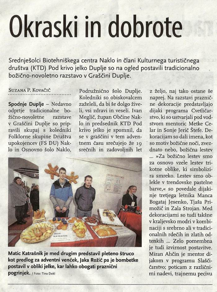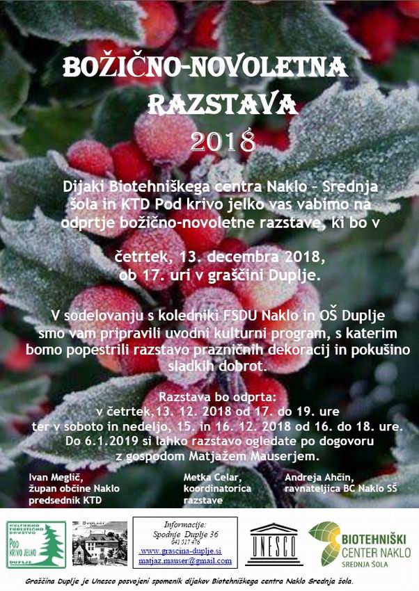 140 13. 12. 2018 19. KOLEDOVANJE in BOŽIČNO-NOVOLETNA RAZSTAVA Dijaki Biotehniškega centra Naklo - Srednja šola in KTD Pod krivo jelko Duplje 13. december 2018 - 6. januar 2019 GORENJSKI GLAS, ponedeljek, 24. decembra 2018 140