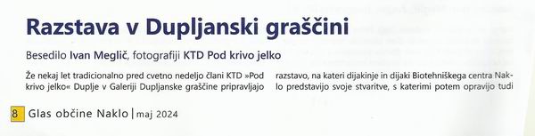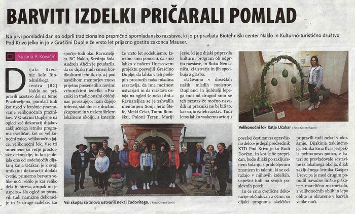 170 20. 03. 2024 POZDRAVLJENA POMLAD VELIKONOČNA RAZSTAVA Razstavljajo dijaki Biotehniškega centra Naklo - Srednja šola. Organizator razstave KTD Pod Krivo jelko Duplje Glas občine Naklo, maj 2024 GORENJSKI GLAS, petek, 22. marca 2024, str. 24 170