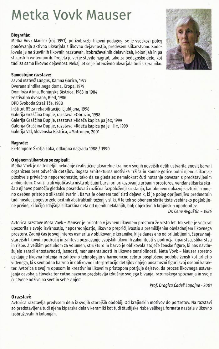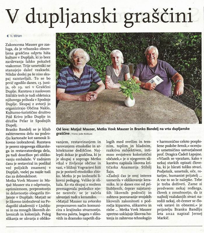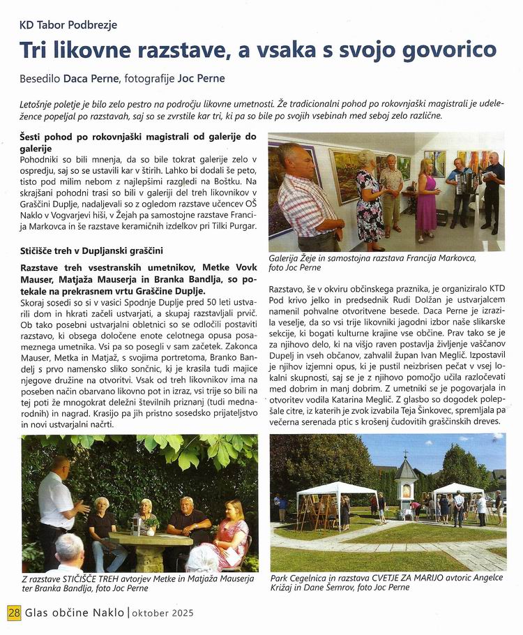 179 13. 6. 2025 "STIČIŠČE TREH" Branko Bandelj - Matjaž Mauser - Metka Vovk Mauser Metka Vovk, avtoportret, 1983 Matjaž Mauser, avtoportret, 1983 Glas občine Naklo, priloga časopisa GORENJSKI GLAS, 13. junij 2025 Glas občine Naklo, oktober 2025 179